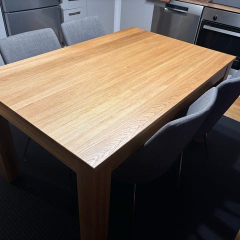 Tammiviilupöytä metallijaloilla (Vepsäläinen) ja kuusi puristenahkaista valkoista tuolia. Pöydän pinnassa vähän käytön jälkiä, tuolit hyvässä kunnossa. Tarjoa!