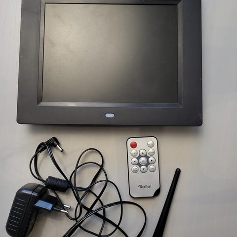 8" näyttö, about vuonna 2011 ostettu, jonkun verran käytössä ollut, mutta täysin toimiva digitaalinen valokuvakehys. Mukaan muistikortti, virtapiuha sekä käsin itse tehty puinen teline.