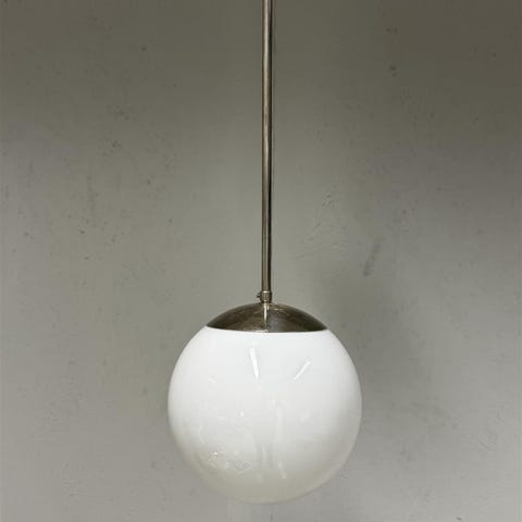 Vintage riippuvalaisin, jossa on valkoinen maitolasikupu ja kromin värinen, metallinen varsi. Valaisimen muotoilu on yksinkertainen ja ajaton, mikä tekee siitä sopivan monenlaisiin sisustuksiin. Metalliosat ovat kiiltävät ja antavat valaisimelle modernin ilmeen. Valmistajaa ei tiedetä, mutta tyyli viittaa 60-luvun modernismiin, joka korostaa funktionaalisuutta ja selkeitä linjoja. Tämä aikakausi tunnetaan minimalistisesta muotoilustaan ja käytännöllisyydestään. Valaisimen kunto on ok. Metalliosissa on näkyvissä kulumaa ja naarmuja. Johto on vanha ja saattaa vaatia uusimista turvallisuuden takaamiseksi, ei testattu myydään sellaisenaan. Lasikuvussa ei ole merkittäviä vaurioita, mutta se kaipaa pintapuhdistusta.