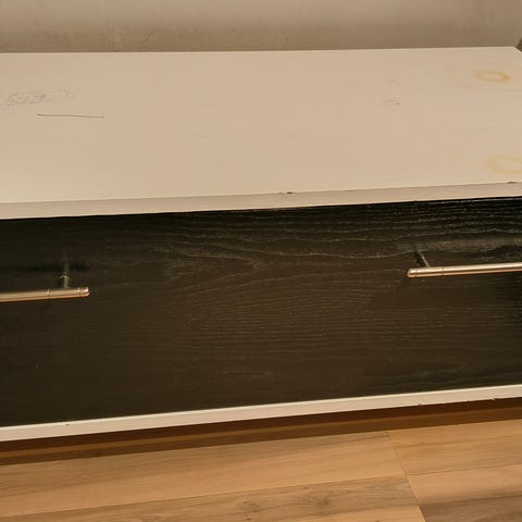 Mustapintainen TV-taso, jossa on avohyllyt ja liukuovi. Taso tarjoaa säilytystilaa elektroniikalle ja muille kodin tavaroille. Käytön jälkiä jonkin verran, muuten ok.