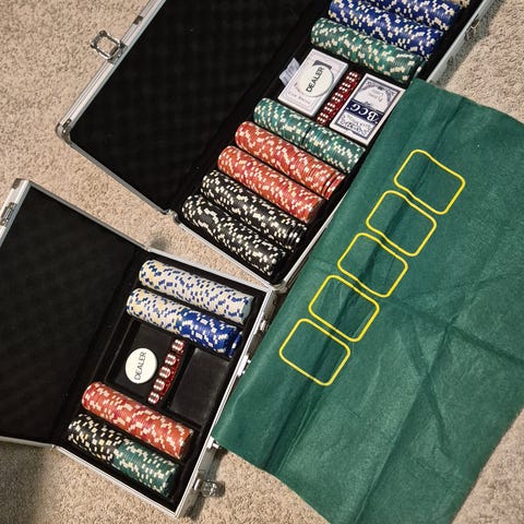 Texas hold em' pelisetti. Pelimerkit 5, 25, 50, 100 ja 500, 100% muoviset pelikortit, 2 pakkaa, salkku.