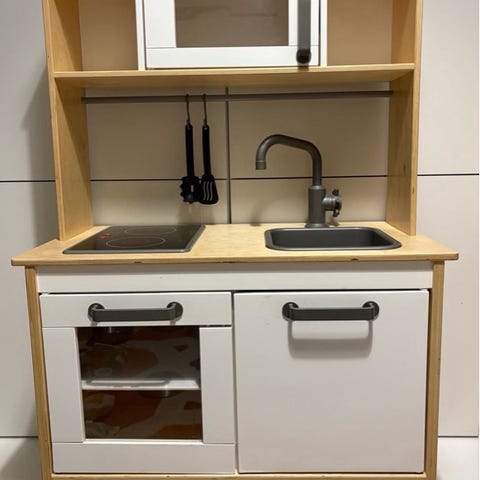 Myydään pieni leikkikeittiö ja kaikki kuvan lelut (kassakone, ruuat, kattilat, lautaset jne.) ja säilytyskori.