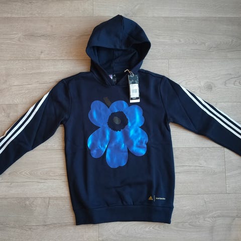 Myydään Adidas-Marimekko huppari kulta unikko printilla. Musta pohja väri hieman haalistunut, mutta printti hyvässä kunnossa. Koko merkintä 152cm, mutta mielestäni hieman naftia mitoitusta, menee kyllä tuota kokoa käyttävälle, mutta voisi ottaa käyttöön jo aikaisemmin esi.146cm.