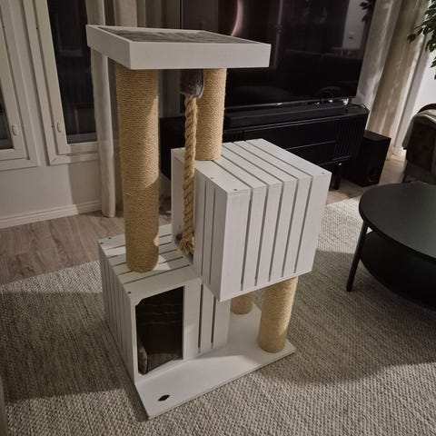 Kolme viikkoa olohuoneen nurkassa ollut ja yhden kissavieraan testaama Trixie kissan raapimapuu, jossa useita tasoja ja koreja. Raapimapuun pylväät on päällystetty raapimisnauhalla, ja siinä on eri korkeuksilla olevat tasot ja kori-istuimet. Sopii kissojen kiipeilyyn, leikkiin ja raapimiseen. Ostohinta uutena 349e
