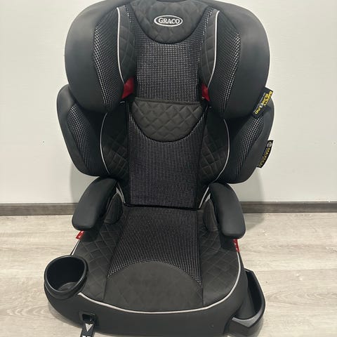 Hyväkuntoinen turvavyöistuin säädettävällä niskatuella. Selkätuen saa tarvittaessa irroitettua kokonaan, niin toimii myös pelkkänä korokkeena. Valmistajan mukaan 100-150cm kokoiselle lapselle.