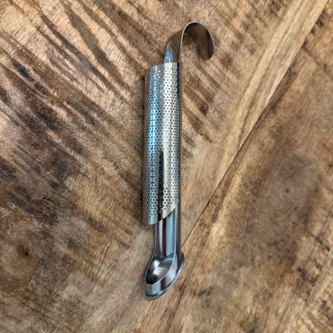Myydään irtoteetä varten teesuodatin vihreällä yksityiskohdalla päässä. Tee laitetaan suodattimen sisään vetämällä hopeaa pallerolla alaspäin.