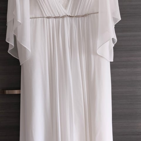 Myydään kuin uusi vain koitettu valkoinen juhlamekko. Sopii koolle L tai jopa Xl. Kokonais pituus on 147cm ja vyötärön ympärysmitta on 42cm.