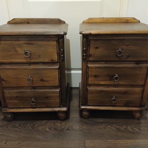 Myydään koristepuusepän käsityönä valmistamat kuvien kokopuiset yöpöydät. Kannen mitat 30 x 35cm, korkeus 65cm. Yläosassa pieni vetolaatikko ja alla kaappi. Toinen oikea- ja toinen vasenkätinen. Siistit ja puhtaat. Vain nouto Suonenjoelta. Yhteishintaan 500,-