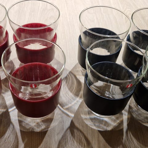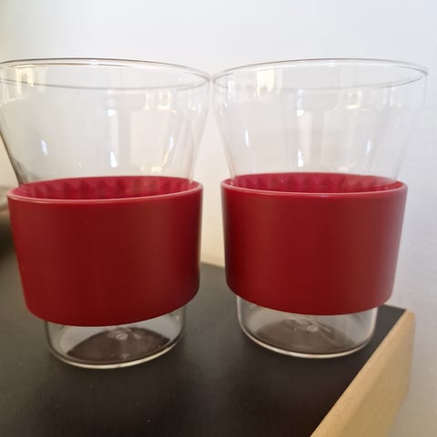 Iittala HotCool lasit, joissa oranssit silikonisuojat. Lasit ovat kirkasta lasia ja silikonisuojat tarjoavat lisäsuojan ja paremman otteen. Toisen lasin silikonissa tumma pieni läiskä (kuvassa).