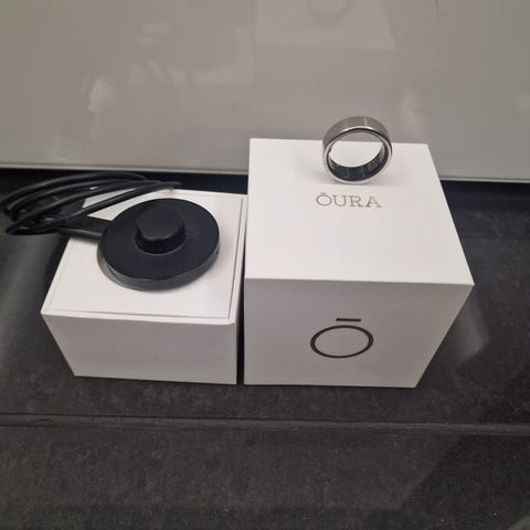 Oura Ring Gen2 Balance väri musta, mukaan laturi sekä alkuperäinen pakkaus.