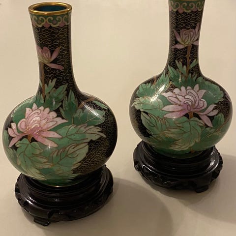 Kaunis käsintehty Cloisonné-maljakkopari, johon kuuluu koristeelliset puiset jalustat molemmille maljakoille.