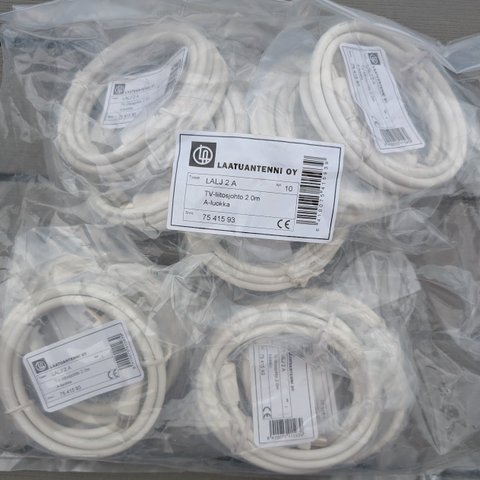 Myydään tarpeettomaksi jäänyt erä täysin etupäässä uusia tai vähän käytettyjä antenniasennustarvikkeita. Mukana on laadukasta kaapelia ja useita erilaisia liitososia alkuperäispakkauksissaan. Sopivat erinomaisesti TV-, satelliitti- ja radioasennuksiin.
