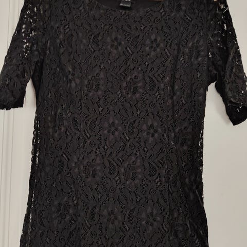 Helman vuorikankaaseen ommeltu joustava pitsinen lisäkaistale, jotta mekko ei olisi helmasta niin läpinäkyvä. Helppo purkaa pois tarvittaessa.