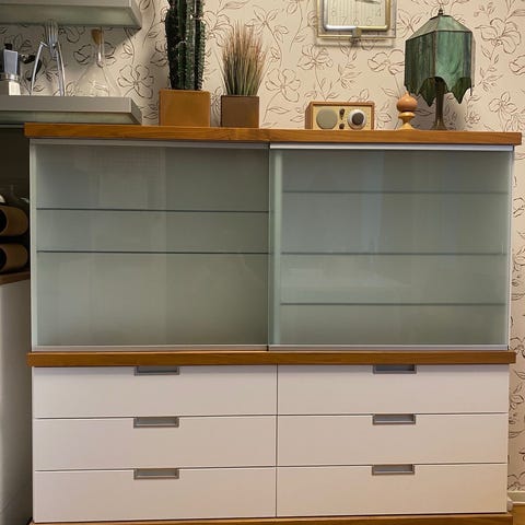Valkoinen puinen senkki, jossa kolme lasiovellista kaappia ja kolme ylälaatikkoa mustilla vetimillä. Sopii säilytykseen ja huonekaluksi erilaisiin tiloihin. Kunnostettu ja maalattu kesä 2024, kunto todella siisti. Ostettu joskus Askosta.
