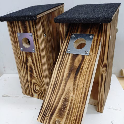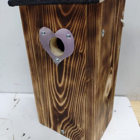 Linnunpönttö valmistettu 5" laudasta,lentoaukko 30mm vahvistettu alumiinipellillä, katolla musta kattohuopa.