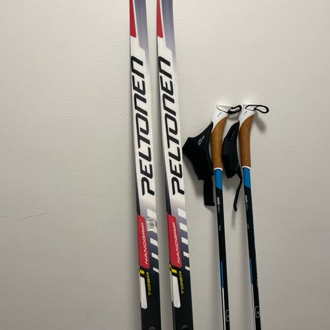Hyvät Peltonen murtomaasukset 160cm sekä sauvat 135cm merkki Rex.