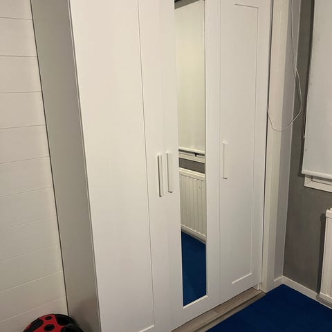 Valkoinen vaatekaappi. Ei näy merkkiä, olisikohan Jyskistä ostettu.