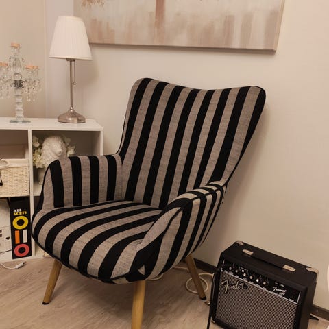 Tukeva harmaa nojatuoli pähkinänruskeilla puisilla jaloilla ja käsinojilla, merkkiä en löytänyt mutta muistaakseni Iskusta tai Askosta, ovh ostohetkellä ollut 250€ luokkaa.