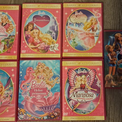 Barbie DVD-elokuvasarjat 1 ja 2, sisältää useita Barbie-elokuvia eri teemoilla. Myös muut kuvissa näkyvät elokuvat mukana samassa setissä. Levyjen kunnot vaihtelevat huonosta hyvään. Yhteensä 26 elokuvaa hintaan 10 €. Barbie Joutsenlampi puuttuu elokuvasarjasta 1.