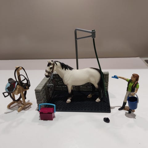 Schleich erittäin siisti ratsastuskauppa. Setti sisältää kuvien mukaiset tarvikkeet, koiran, hevosen ja ihmiset. Tarvikkeita on runsaasti. Setti ei ole täydellinen. Sillä on kuitenkin kiva leikkiä edelleen ja laajentaa esim. eläimillä ja hoitotarvikkeilla. Puuhastelua riittää.
