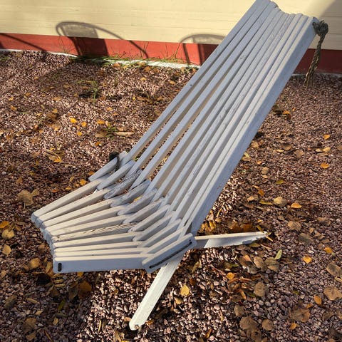 Ecofurnin valkoinen puutarhatuoli tyynyllä. Tuoli on jo käytetympi, mutta ehjä.