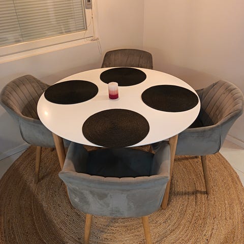 Tästä jyskistä ostettu ruokailuryhmä uuteen kotiin. Myydään kokonaisuutena. Mukaan lisäosa jolla saadaan pöydästä pidempi n. 200 cm pitkäksi. Pöydässä pieniä pinta naarmuja.