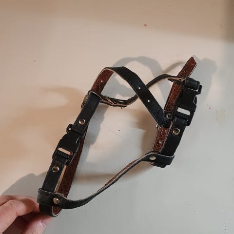 Arja Vänttisen valmistamat poronnahkaiset kissanvaljaat. Valjaat on säädettävät ja niissä on sivusaumassa heijastin nahkaosuuksissa, väri violetti/lila, nyöriosa musta. Koko L, mikä sopii hyvin esim. ragdoll-rotuisille kissoille.