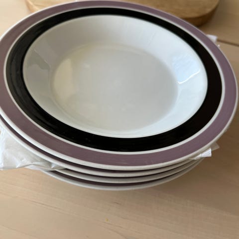 Arabia lautaset, joissa sininen kuvio reunoilla. Lautaset soveltuvat ruokailuun ja kattaukseen.