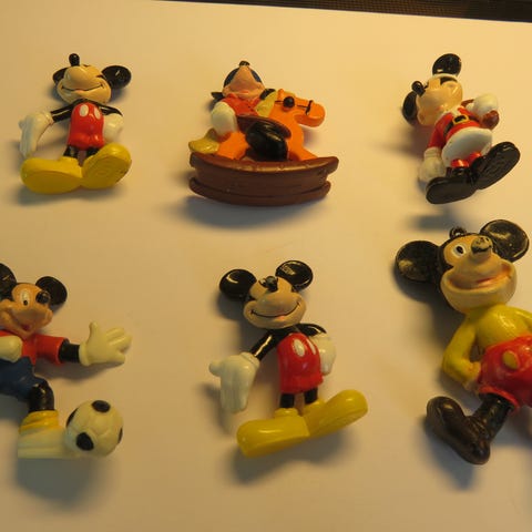 Hyväkuntoiset vanhat Disney figuurit, kaksi Mikki Hiirtä ja Minni Hiiri.