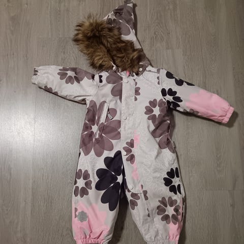 Yleisilmeeltään siisti toppahaalari. Pientä kulumaa polvissa, väri haalistunut haaroista ja pientä kulumaan pepussa. Jalkalenksut paikoillaan. Koko 80cm.