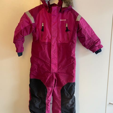Siisti haalari. Käytön jälkiä on joitakin ja pari pientä reikää polvien sisäpuolella(kuvat). Voi paikkailla jos näkee tarvetta. Ei haittaa käyttöä. Mmm