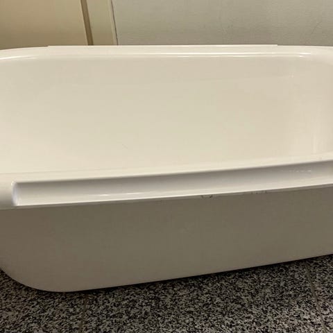 Kaksi erillistä vauvan kylpyyn tarkoitettua tuotetta. Toisessa on mukana tappi. Väri valkoinen, materiaali muovi.
