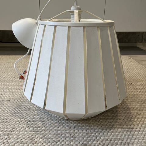 Valkoinen riippuvalaisin. Valkoinen peltinen 38cm halkaisija. Pölyinen ja jotain pikku käytön jälkiä.