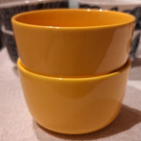 Kaksi Marimekon 2,5dl kulhoa Räsymatto kuviolla.