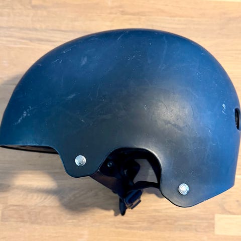Bell kypärä, väriltään keltainen. Kypärässä on useita ilmanvaihtoaukkoja ja säädettävä leukahihna. Sisäpuolella pehmusteet istuvuuden parantamiseksi.
