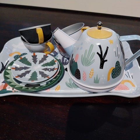 Peltinen teeastiasto, jossa teekannun sisällä soittorasia. Hyväkuntoinen setti.