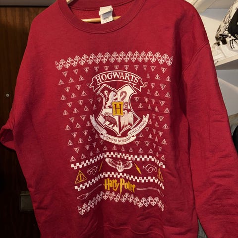 Erinomaisessa kunnossa, kerran käytetty. Väljä malli, mahtuu myös M-kokoiselle. Kultainen Hogwarts-logo, hihassa Hogwarts-teksti.