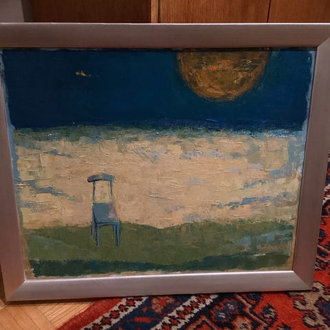 Aki Jalavan öljyvärimaalaus Yö, vuodelta 1995. Koko: kehyksillä korkeus 64 cm ja leveys 56 cm, maalauksen koko: korkeus 45 cm ja leveys 37 cm. Teoksen takana on merkintä Turun Taidelainaamo numero 169.