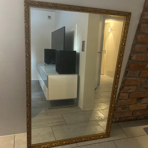 Barokkityylinen hopea / hopeanvärinen / hopeaksi maalattu seinäpeili. Käytetty, mutta hyväkuntoinen ja ehjä.