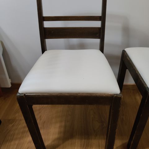 Toinen tuoli on moitteettomassa kunnossa ikänsä huomioiden, toinen hyvässä tyydyttävässä kunnossa, sillä istuinosassa on pientä painaumaa.