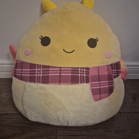 Squishmallows lasten pehmolelu, jossa on vaaleanpunainen, sininen ja violetti väritys sekä sokerimaisen näköinen kuviointi. Pehmolelu on pyöreä ja pehmeä, sopii lasten leikkeihin ja keräilyyn. Korkeus 45cm ja leveys 45cm. Pesty lv:n hajustattomalla pesuaineella. Taloudessa ei eläimiä eikä tupakointia.