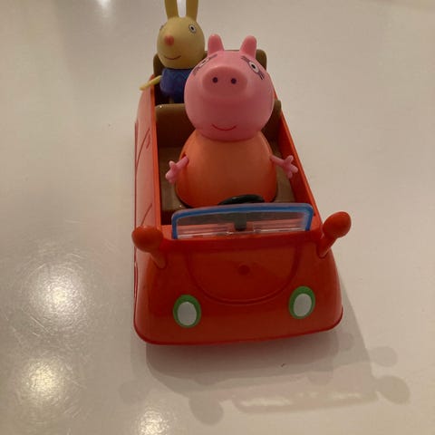 Pipsa Possu leluauto, punainen väri, muovimateriaali. Sisältää kaksi hahmoa: äiti possu ja Pipsa possu, jotka sopivat auton sisälle. Auton äänet ja toiminnot kunnossa. Myynnissä myös muualla