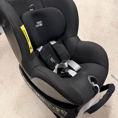 Britax Römer Dualfix kääntyvä turvaistuin, joka on tarkoitettu enintään 0-18 kg. Istuin on mustan värinen (ei pesty, joten pieniä käytönjälkiä on) ja se on helppo kiinnittää isofixin avulla.