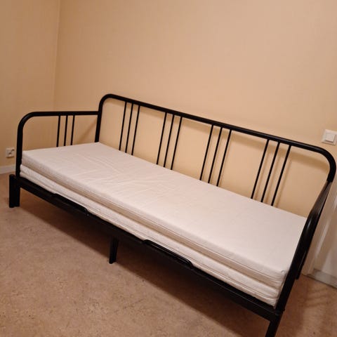 Vierashuoneessa ollut, vähällä käytöllä. Mukaan saa halutessaan kaksi ikean paksua joustinpatjaa (kuvassa päällekkäin niin sohva on korkea).