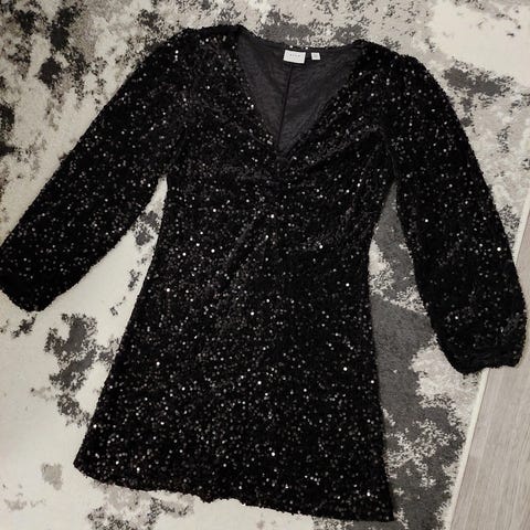 Musta honey punch merkkinen lyhyt paljettimekko, kokomerkintä M, mutta mielestäni vastaa paremmin S kokoa.