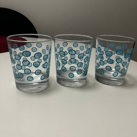 Kuvien mukaiset turkooseilla palloilla olevat Ikean juomalasit.