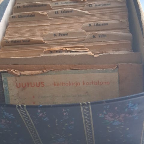 Myydään retro mestarikokin ruokaohje laatikko, 1970-luvulta. Ohjekortit hyvässä kunnossa. Mitat 17,5x36,5x14