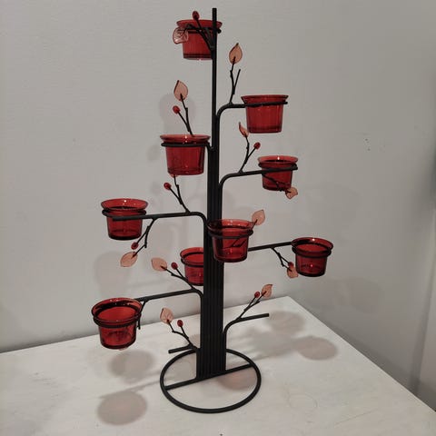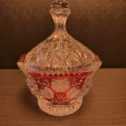 Väri on pääosin kirkasta lasia, jossa on punaisia elementtejä. Löytyy vähän steariininjäämiä, pyrin poistamaan ne kaikki ennen postitusta. Täysin ehjä.