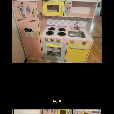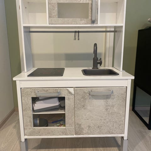 Ikean lasten keittiö. Yläosa kuuluu mukaan on käyttämättömänä paketissa. Hellan valot toimii. Kuvassa olevat leikki astiat saa myös mukaan
