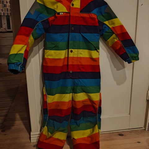 Meille uutena tullut, mutta kovassa käytössä ollut Molon superlämmin toppahaalari kokoa 104cm. Haalari pitää edelleen lämpimänä, mutta kulumaa jo etenkin heijastimissa. Takana lahkeissa olevat tähdet ovat irronneet kokonaan. Savuton ja eläimetön koti.